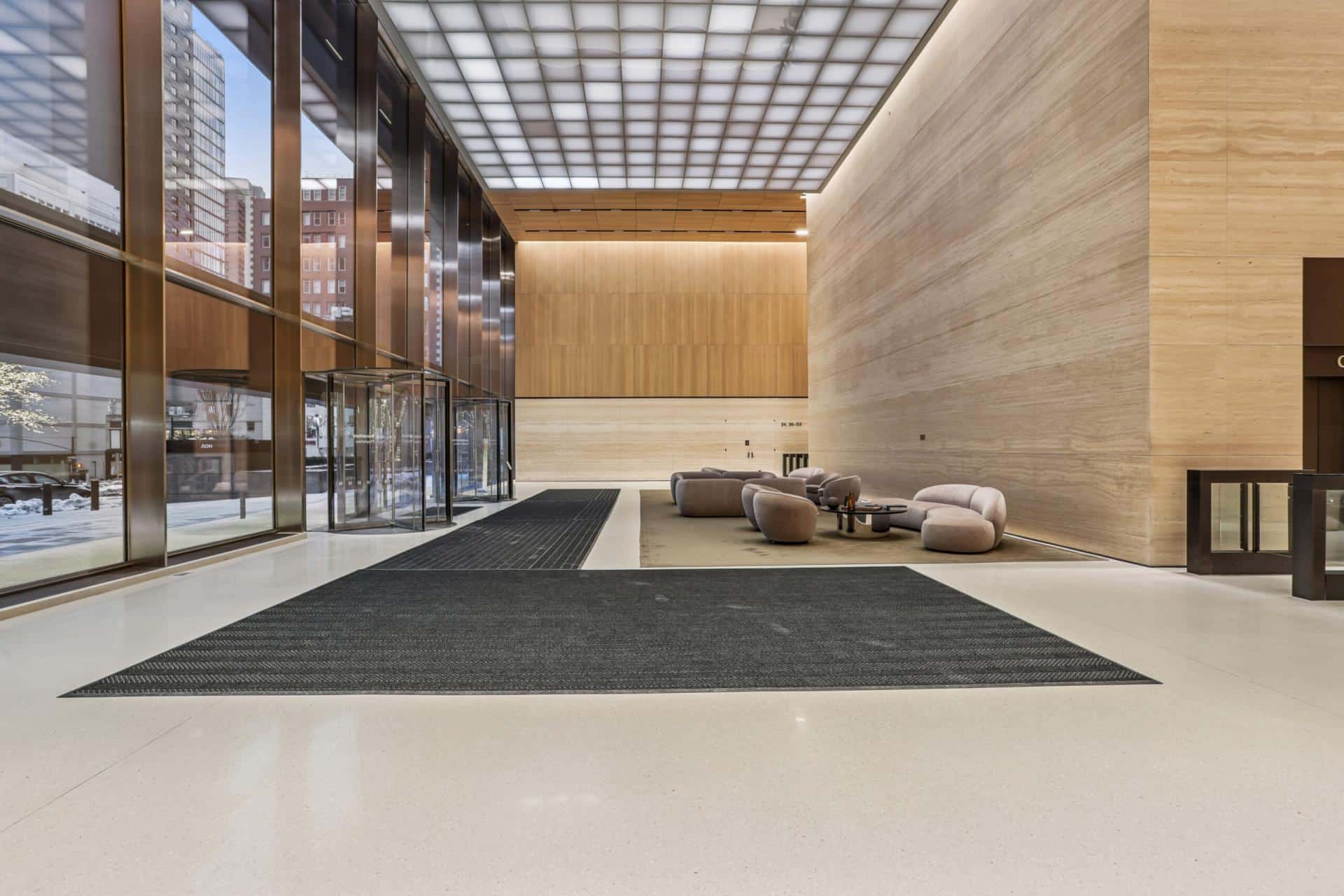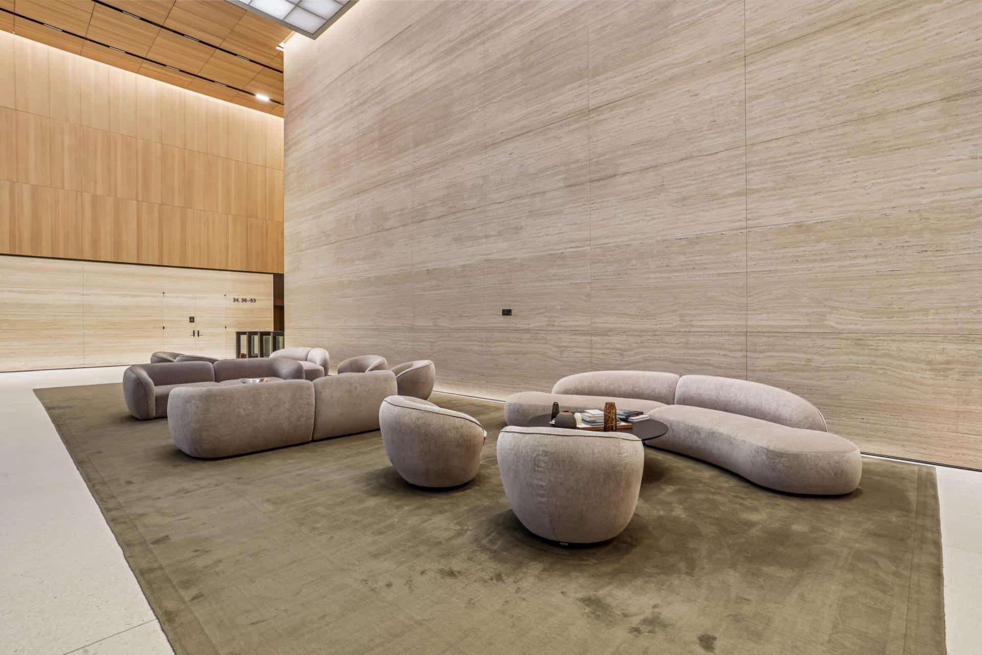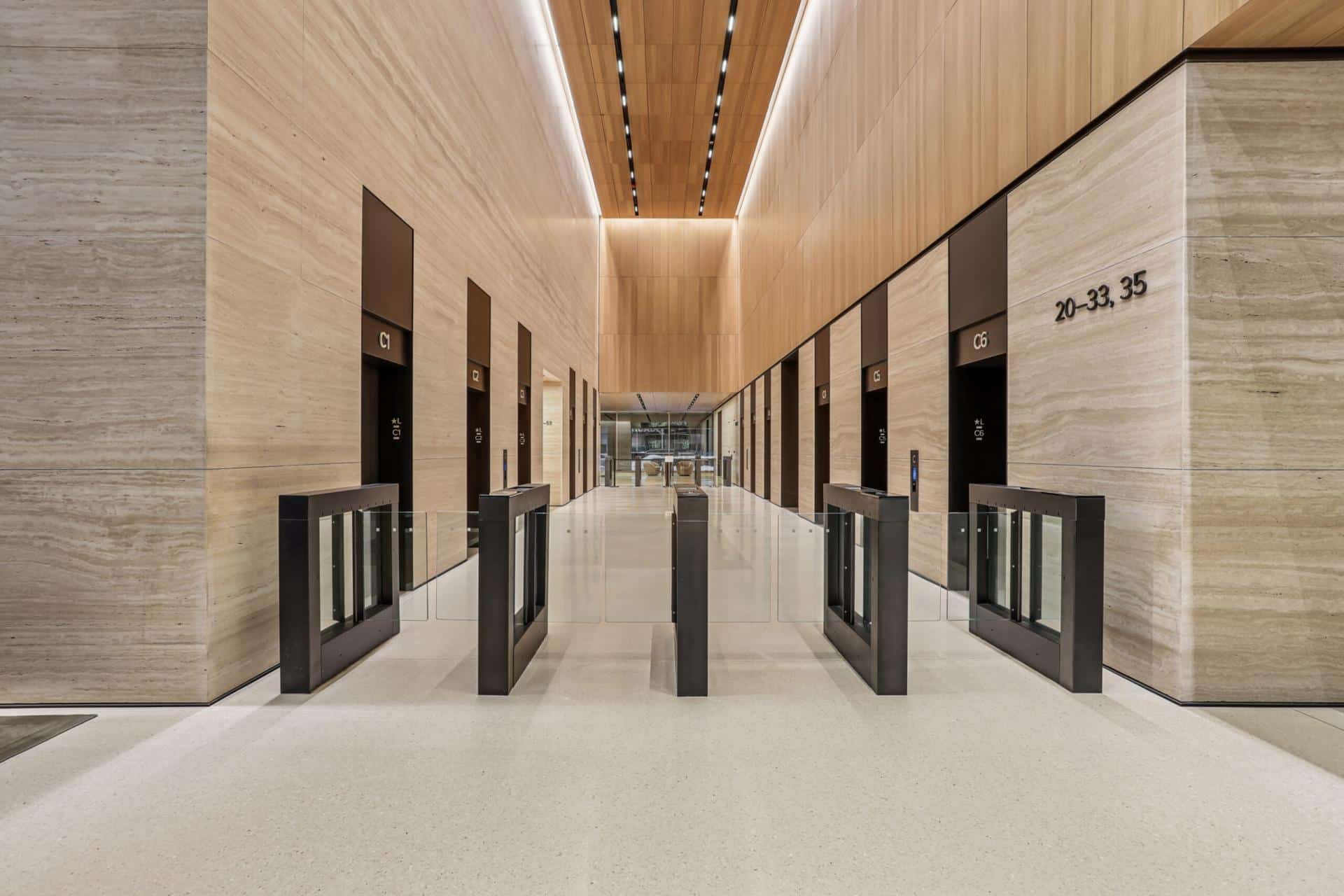 The terrazzo aggregates incorporated the same Botticino marble used for the stone wall panels throughout the lobby area providing a coordinating feel integrating from the floors to the walls in this beautiful classic space.