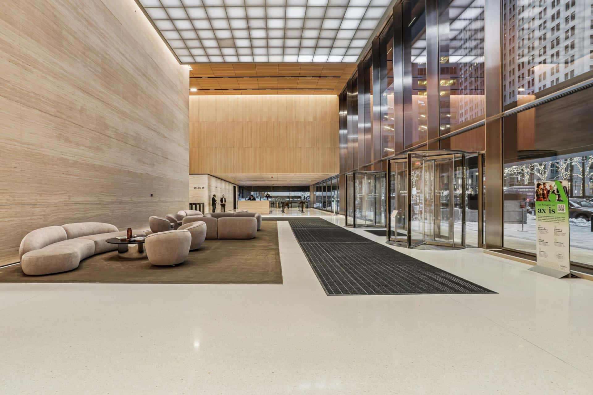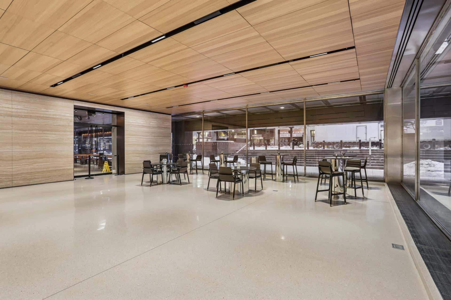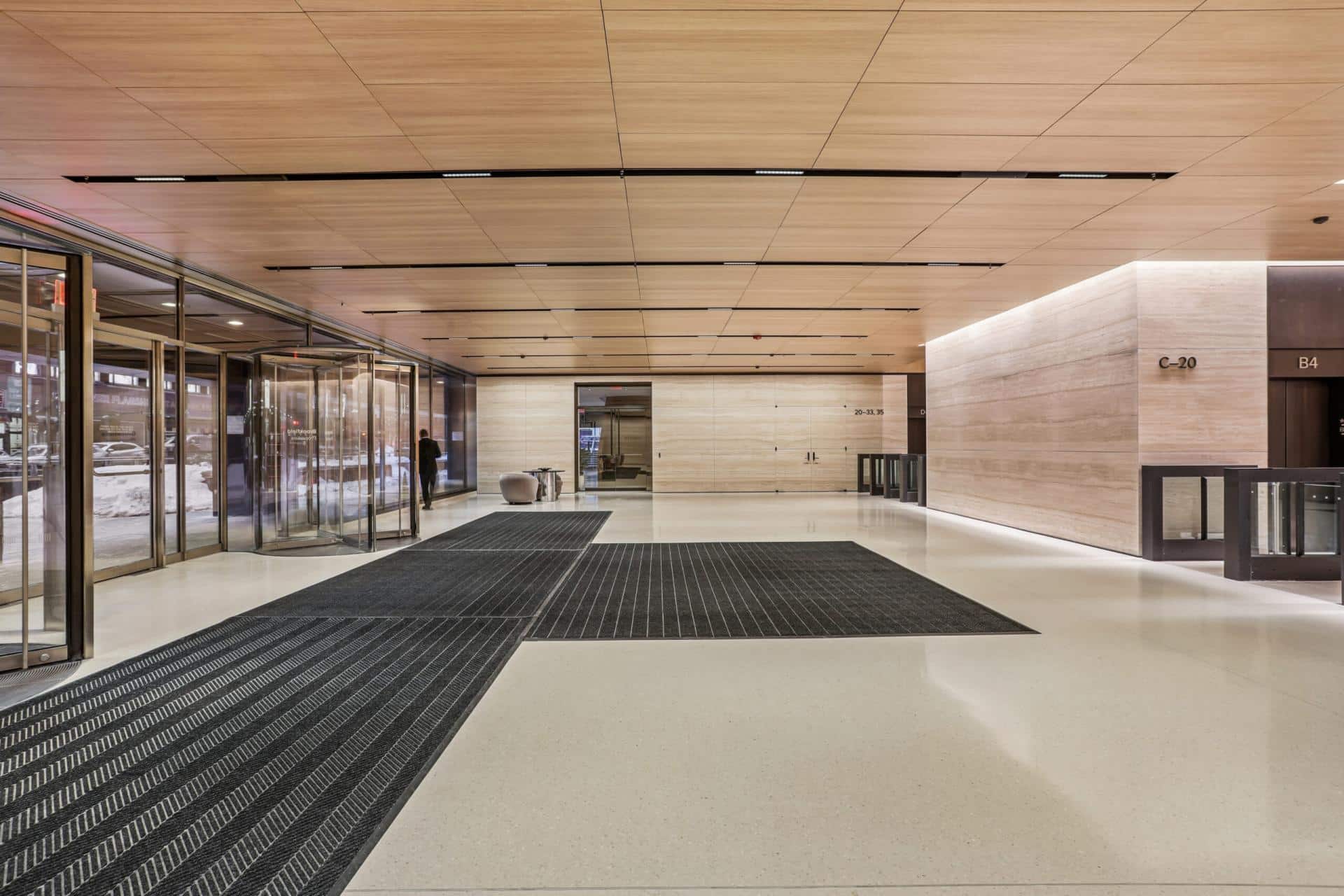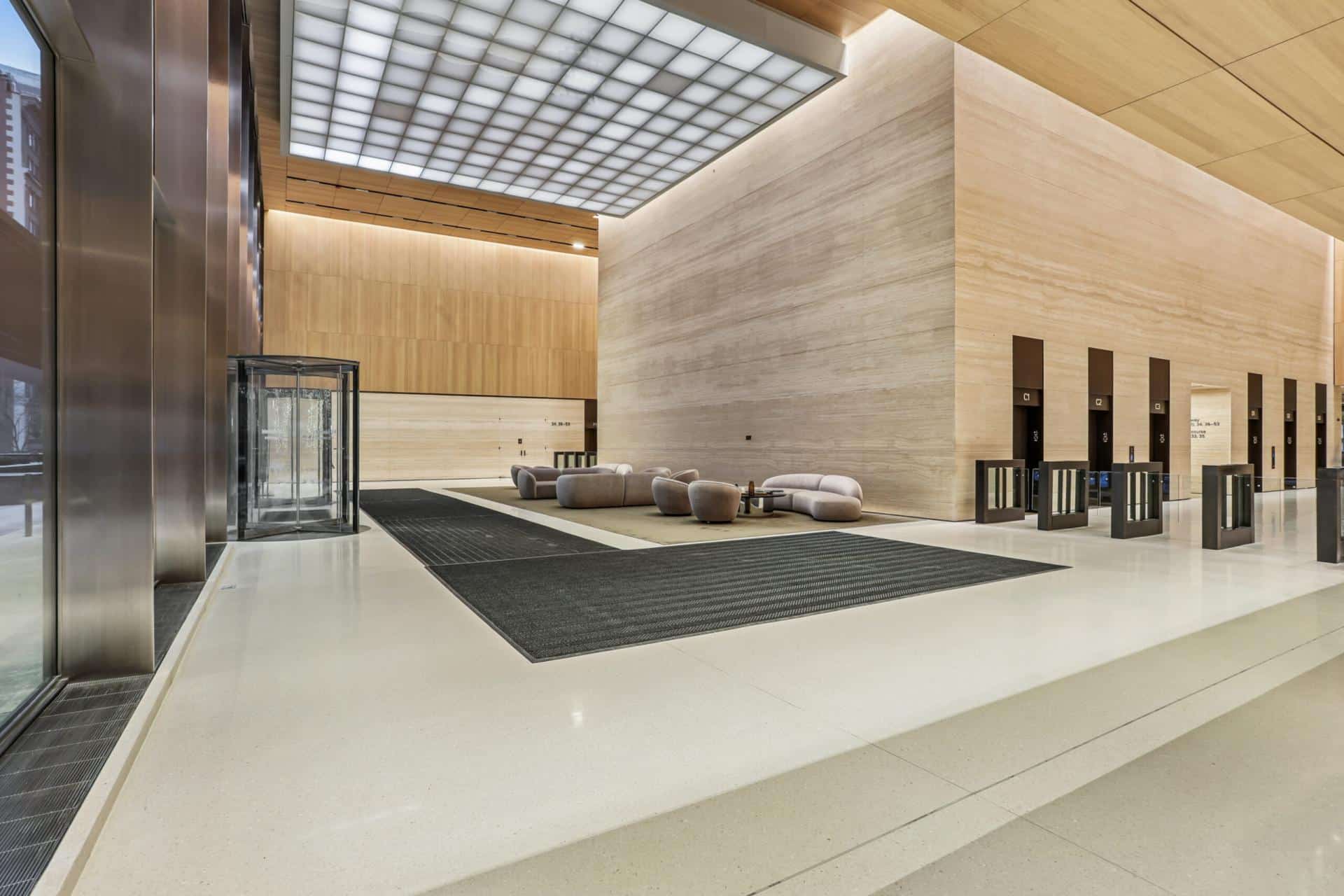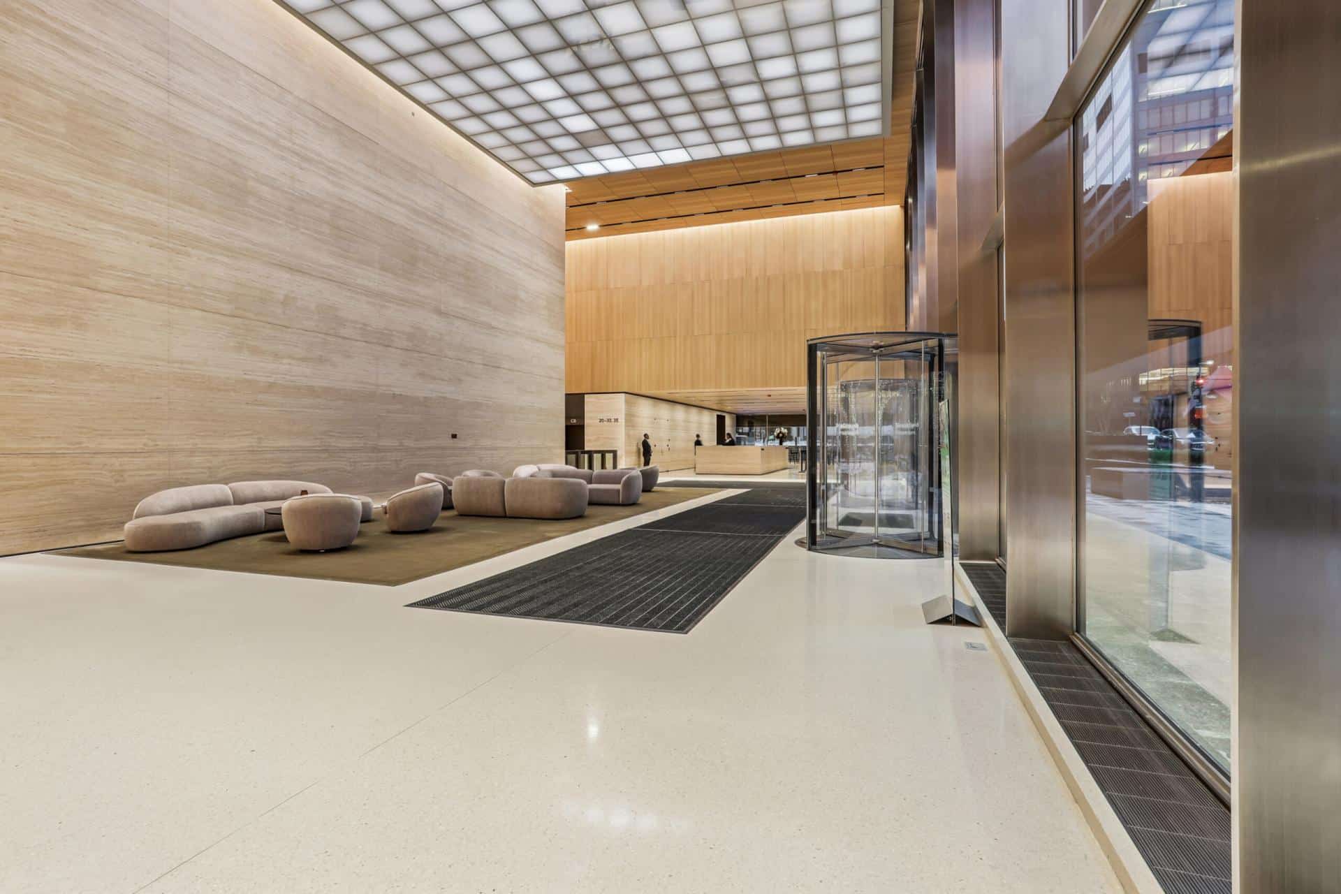 The T. Yorie Corp installed terrazzo flooring throughout the main lobbies & installed custom terrazzo molding pieces at interior curbs.