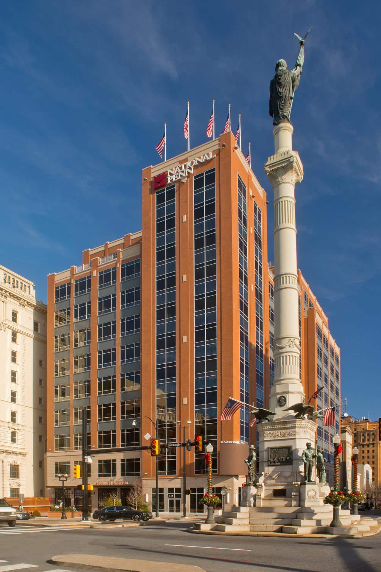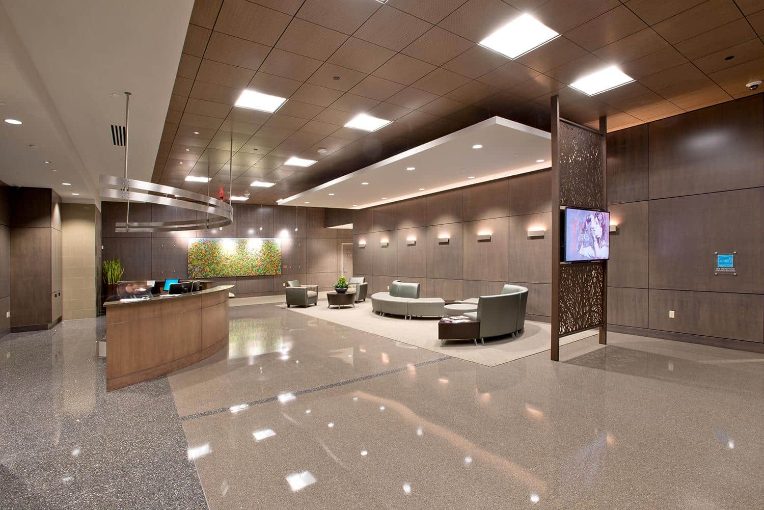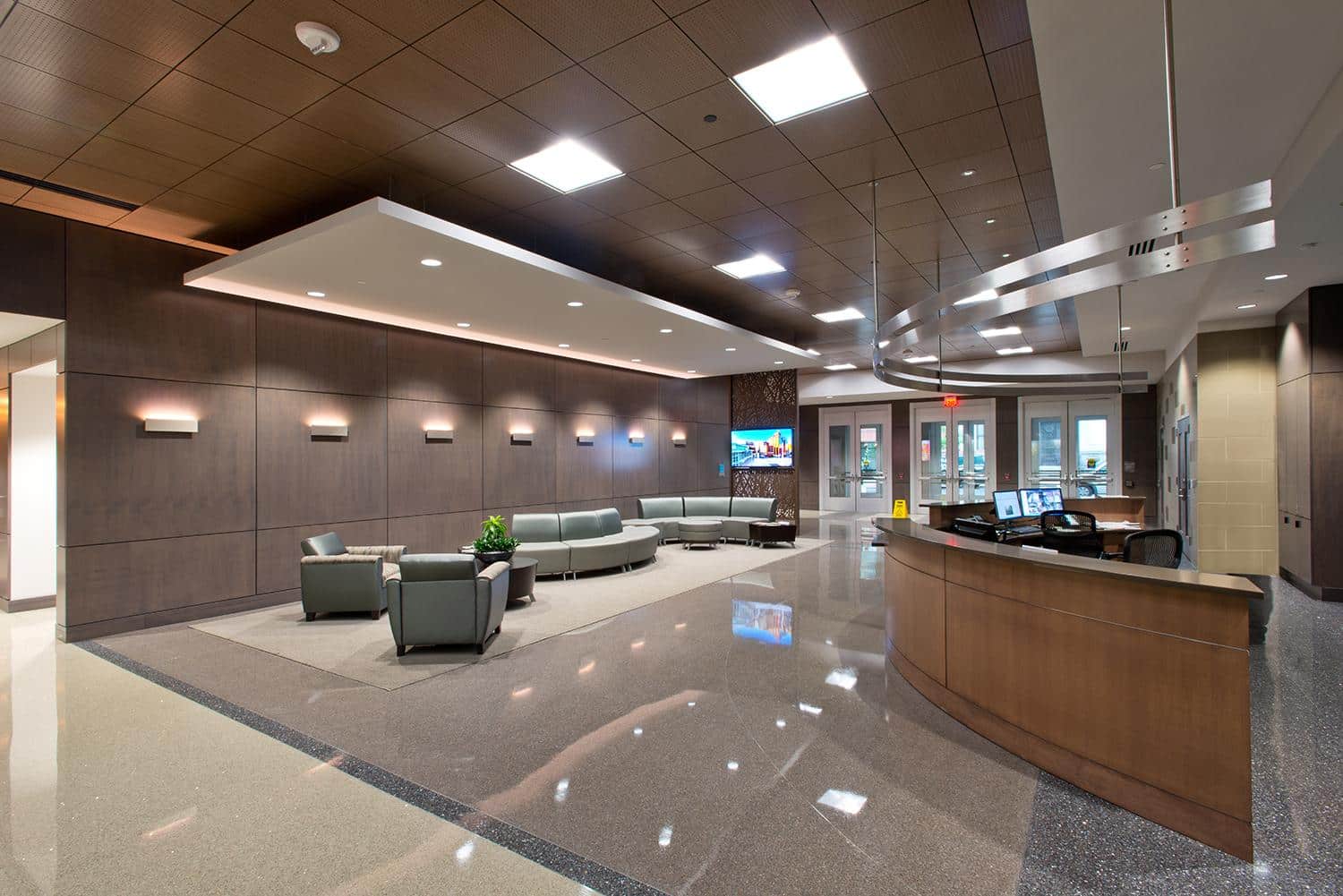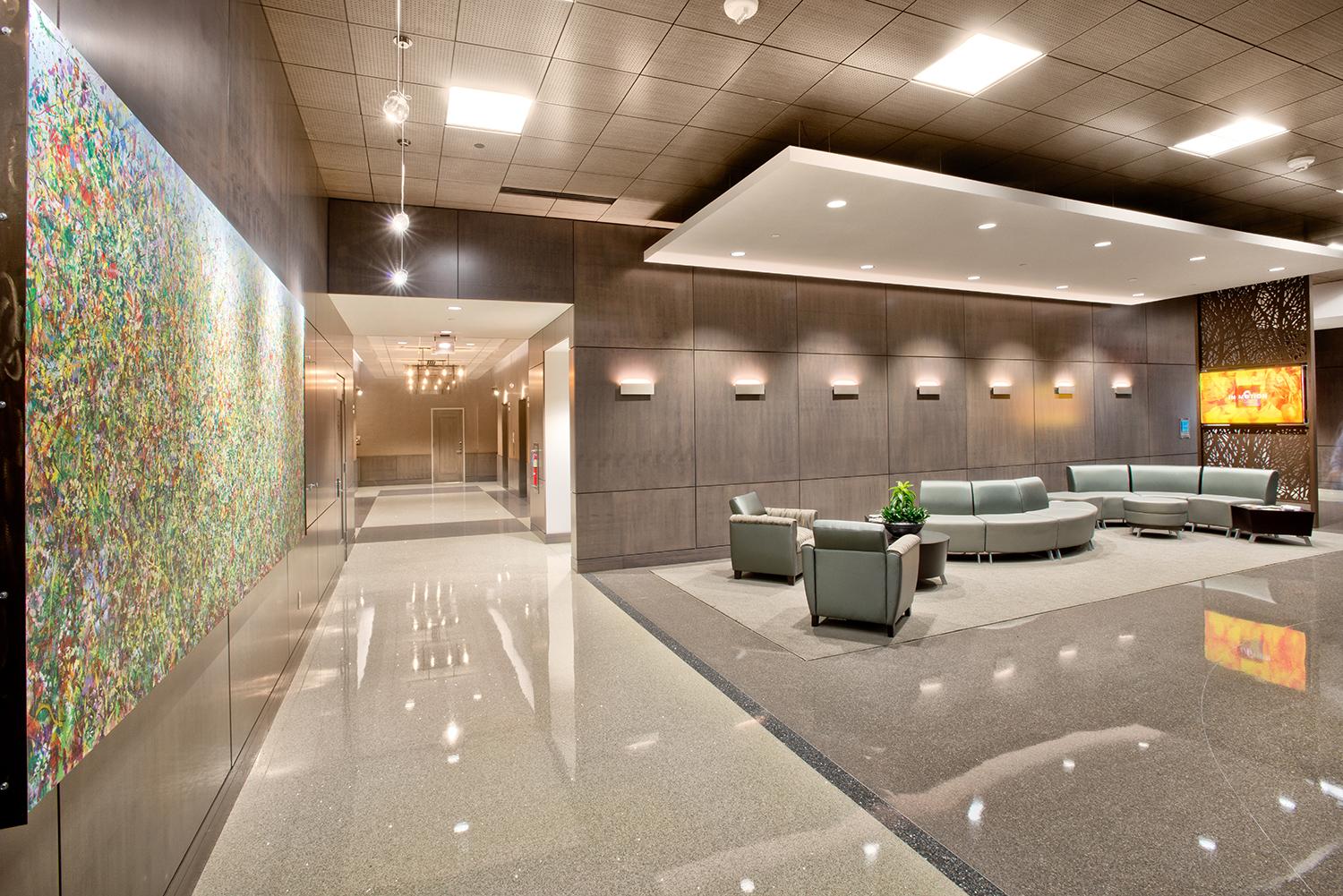A classic three color terrazzo floor sweeps through the main lobby of this premium office building in the heart of downtown Allentown.