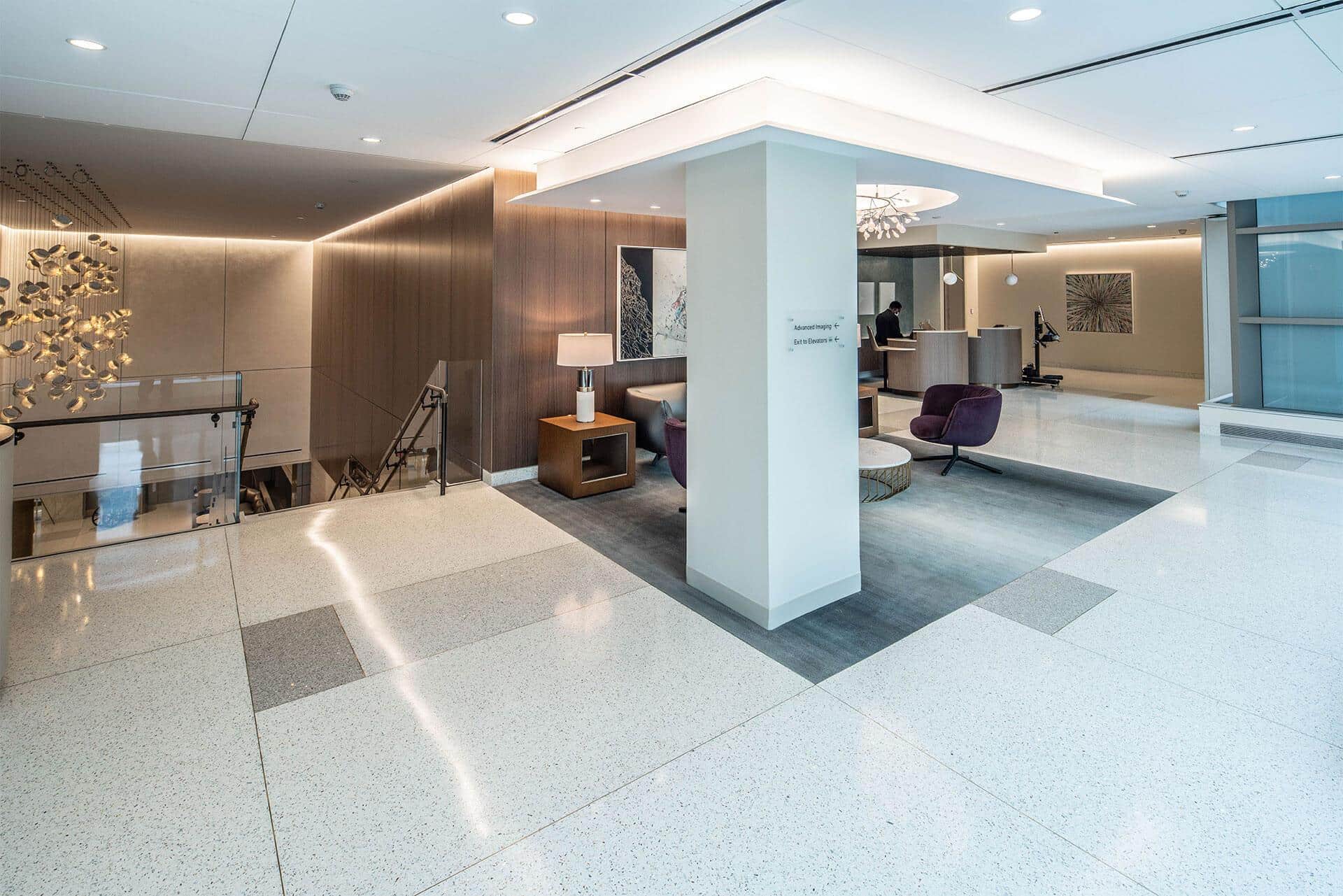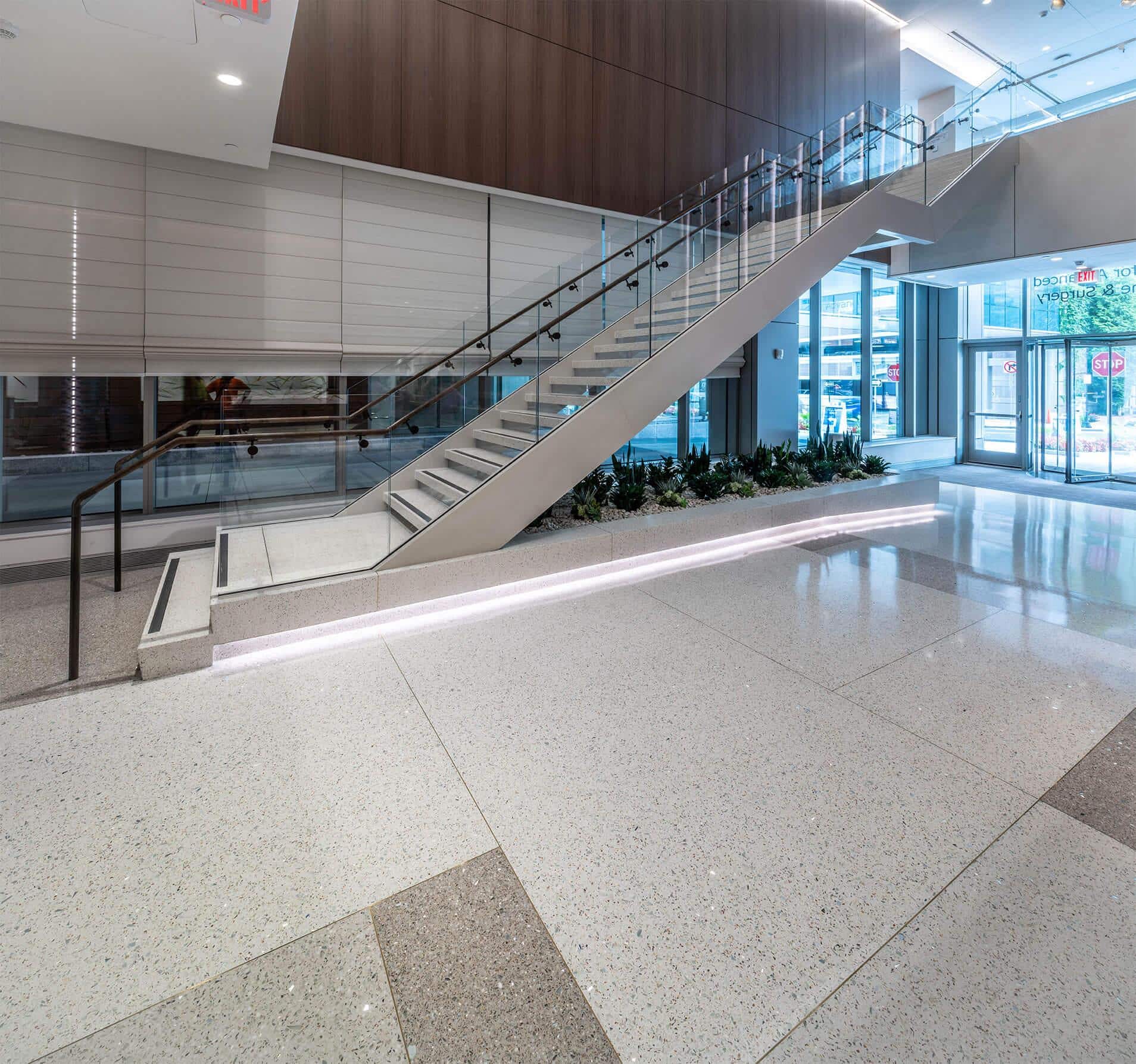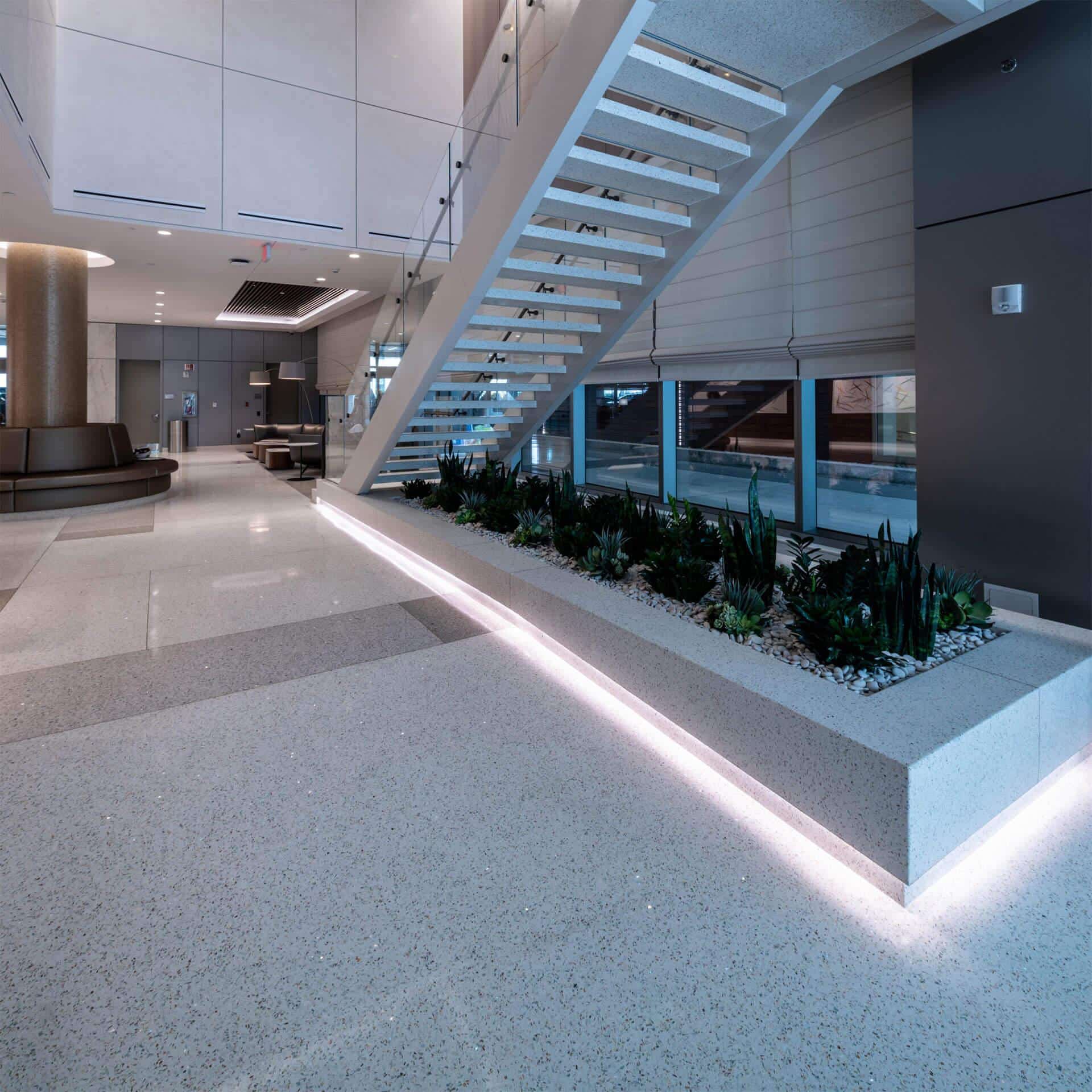 The New Center for Advanced Medicine & Surgery is the most significant addition to White Plains Hospital’s ongoing campus transformation. The terrazzo floor span all 10 levels throughout the facility and a focal point of a grand stair with floating epoxy terrazzo treads and a poured in place vertical terrazzo planter below.